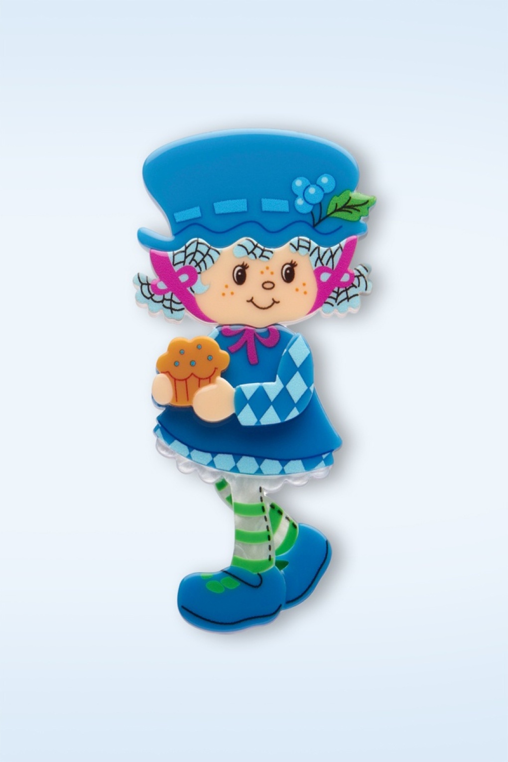 “I’m a bit of a dreamer, always lost in my stories, and my friends think I’m rather generous. My best buddy, Cheesecake the mouse, helps keep me on track. Friends forever!“ * Bonny Blaubeer ist online exklusiv in den Niederlanden, Deutschland und Belgien bei Topvintage erhältlich * Handgefertigt, handbemalt und unterschiedlichen Harzschichten * Silberfarbener Stiftverschluss * Kaufe 2 oder mehrere Artikel dieser ‚Strawberry Shortcake Part 2‘ Kollektion und erhalte eine Surprise Brosche als Geschenk (solange der Vorrat reicht!) * ERSTWILDER X STRAWBERRY SHORTCAKE PART 2