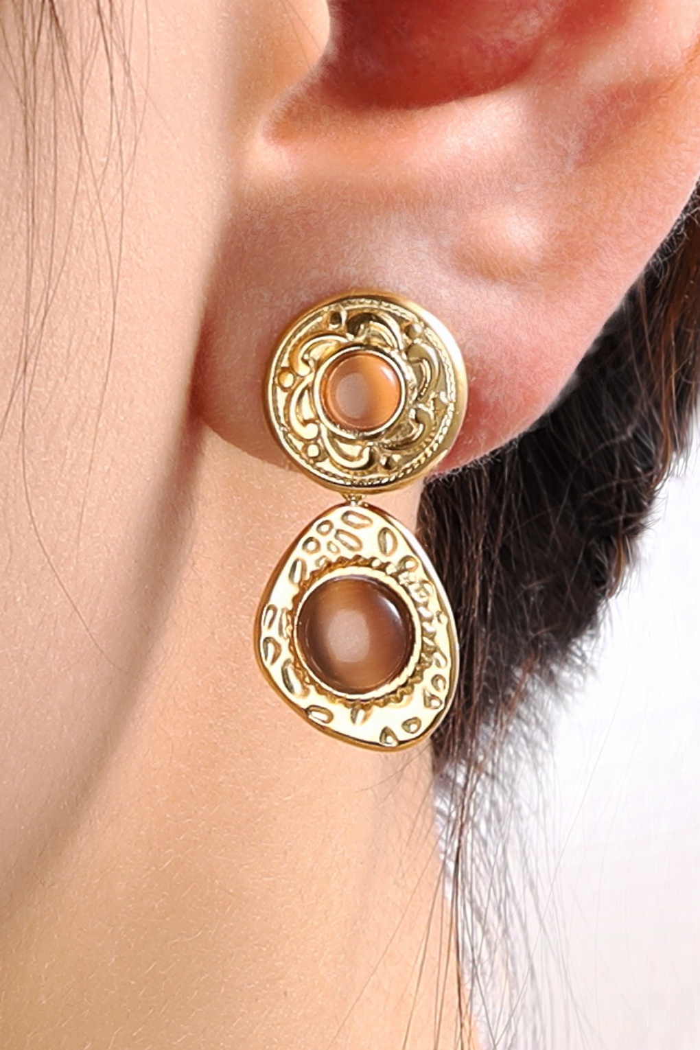 Etwas Geheimnisvolles haftet an deinem Outfit, wenn du diese wunderschönen Ohrstecker trägst! Inspiriert von mediterranen Sphären und aus hochwertigem Edelstahl gefertigt, wurden sie mit einer (recycelten) 14-karätigen Goldbeschichtung versehen und sind zudem wasserfest. Die Cat-Eye-Steine werden mit Hellsehen und Intuition assoziiert und sollen vor negativen Einflüssen von außen schützen. * Ohrstecker * Wasserfest * Edelstahl * (recycelte) 14-karätige Goldbeschichtung * Halbedelstein (Cat-Eye) * Nickelfrei