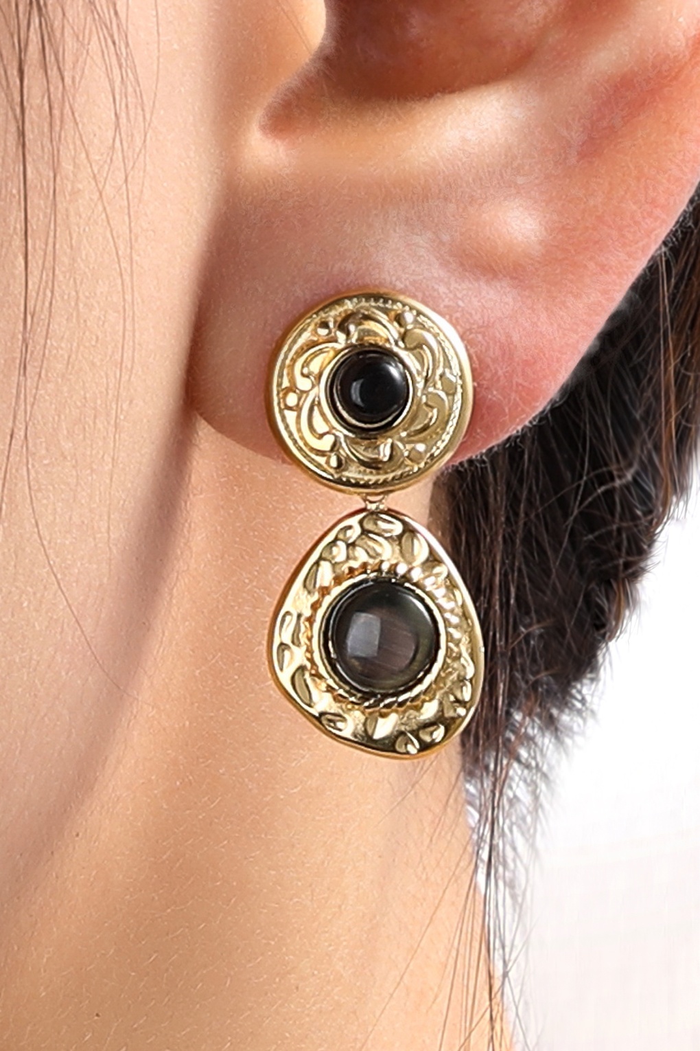 Etwas Geheimnisvolles haftet an deinem Outfit, wenn du diese wunderschönen Ohrstecker trägst! Inspiriert von mediterranen Sphären und aus hochwertigem Edelstahl gefertigt, wurden sie mit einer (recycelten) 14-karätigen Goldbeschichtung versehen und sind zudem wasserfest. Der Cat-Eye-Stein wird mit Hellsehen und Intuition assoziiert und soll vor negativen Einflüssen von außen schützen. Der ‚Onyx‘ Stein dadrunter stimuliert das analytische Denken, Logik, Konzentration und hilft dir klar zu denken. * Ohrstecker * Wasserfest * Edelstahl * (recycelte) 14-karätige Goldbeschichtung * Halbedelstein (Cat-Eye) * Onyxs * Nickelfrei