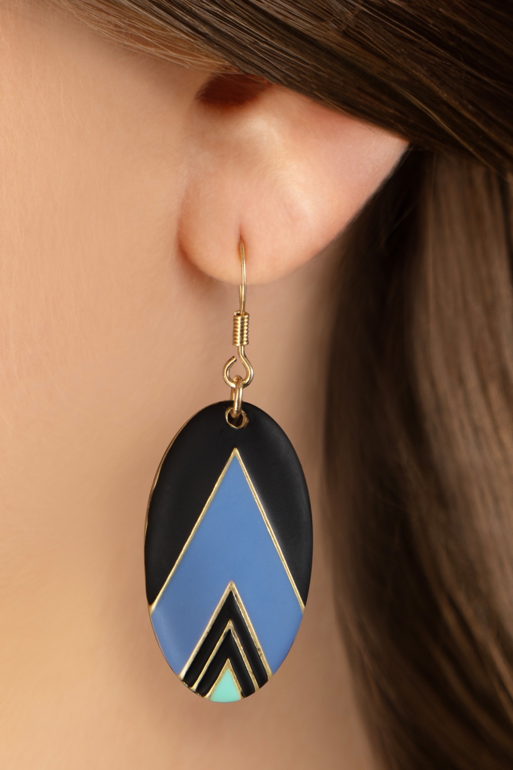 Ein Kunstwerk! – Diese Ohrringe wurde aus goldfarbenem Messing gefertigt und mit einem Art déco-inspierierten Anhänger mit matter Emaille in Kornblau, Schwarz und Mint verziert. * Messing (antik-goldfarbenes Metall) * Handbemalte Emaille * Hypoallergene Hänger * Nickelfrei * Kombiniere mit der passenden Halskette & vollende deinen Look