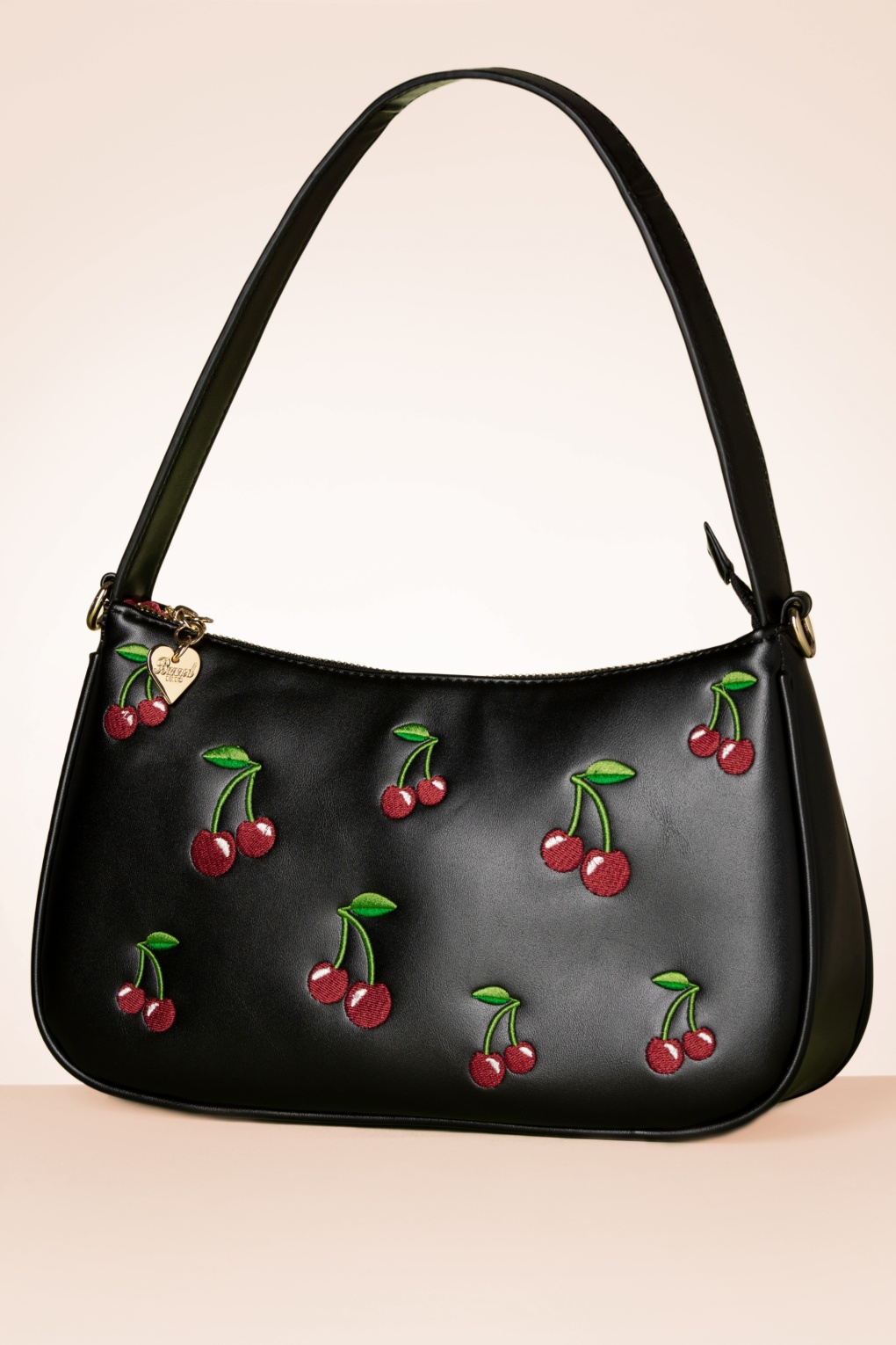 “You will cherry-ish this Wild Cherry Handbag in Black forever!“ Gefertigt aus schwarzen Kunstleder mit einem kurzen Henkel und gestickten Kirschen an der Vorderseite. * Kleine, rechteckige Tasche * Reißverschluss * Innenfach mit 3 extra Fächern, eins davon mit Reißverschluss * Extra Fach mit Reißverschluss hinten * Abnehmbarer Henkel * Kann ‚crossbody‘ getragen werden * Komplett gefüttert * Ausreichend Platz für dein Handy, deine Schlüssel, ein kleines Portemonnaie und deinen Lieblingslippenstift