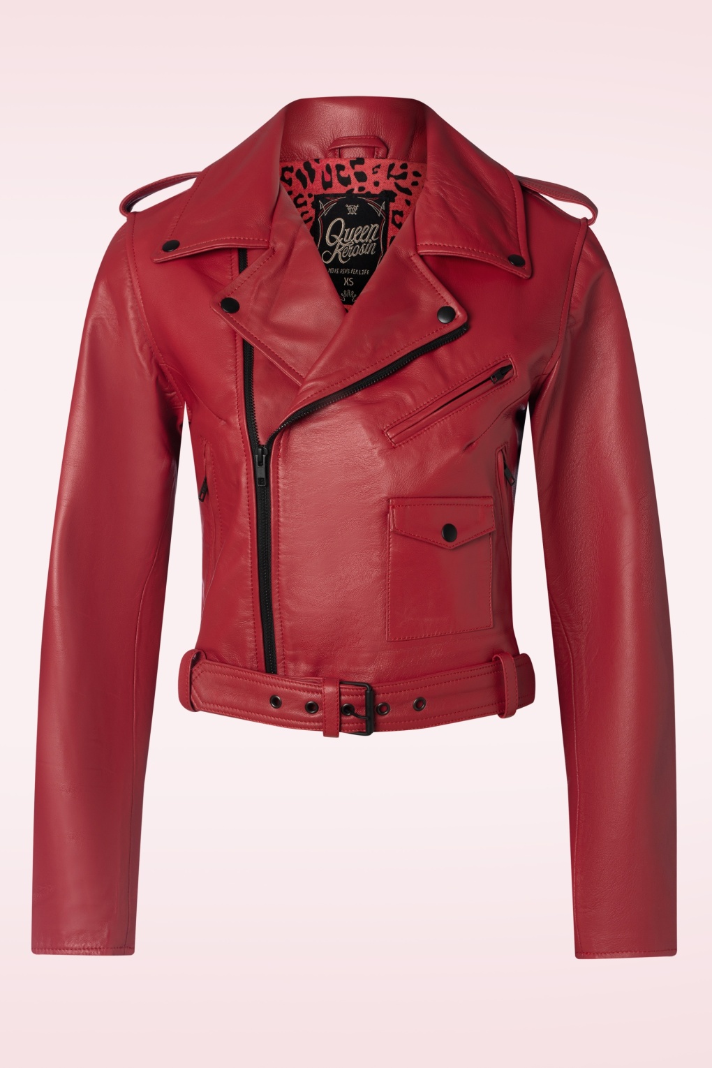 “Baby doll, you need some rock ’n roll!“ Diese coole Marlon Biker Jacke wurde aus einem qualitativ hochwertigen und angenehmen tiefroten (100%) Leder gefertigt und komplett mit einem Leopardenstoff gefüttert * Echtes Leder! * Spitzer Kragen mit Druckknöpfen * Komplett gefüttert und versehen mit einer Innentasche mit Reißverschluss * Reißverschluss und Gürtel * ‚It has pockets!‘ * Lang genug, um mit einer normalen Hose kombiniert zu werden