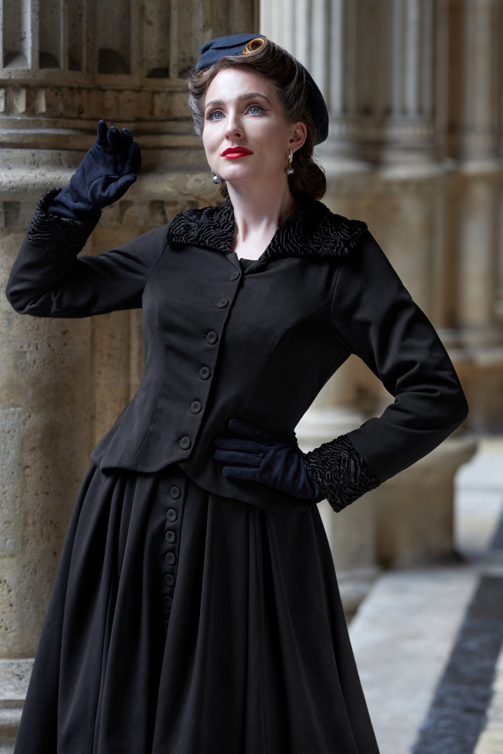 “A timeless piece that belongs in every woman’s wardrobe!“ Dieser elegante Blazer der Kollektion “Vintage Glam Icons“ der Marke Miss Candyfloss erinnert an die glamourösen ersten Supermodels! Dieses Schätzchen wurde aus einem festen, aber angenehmen schwarzen Stoffmix mit einem Hauch Viskose gefertigt und mit einem Kunst-Pelzkragen und Manschetten versehen. * Blazer * Tailliertes Modell * Kunst-Pelzkragen und Manschetten * Komplett gefüttert für den Extra Komfort * Lange Ärmel * Knopfreihe * Subtiles Peplum Detail * Lang genug, um mit einer normalen Hose kombiniert zu werden * Vollende deinen Look und kombiniere diesen Blazer mit dem passenden Krita Lou Swing Rock