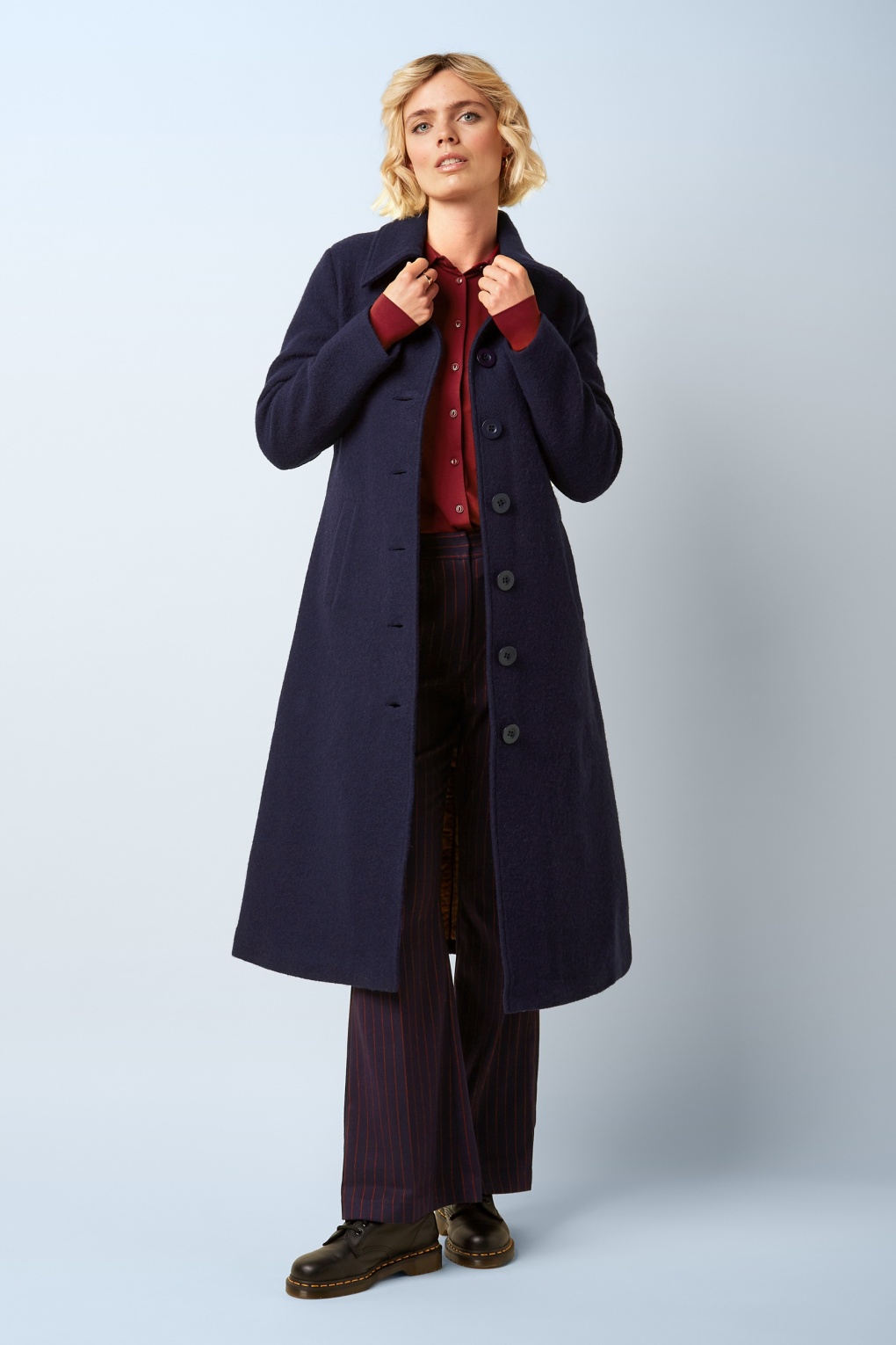 Mit diesem Teil bist du für den Herbst bestens gerüstet! Dieser wunderschöne lange Mantel hält dich behaglich warm, denn er ist aus 100 % hochwertiger Wolle (nicht elastisch) in Dunkelblau gefertigt und vollständig mit einem satinierten Streifenstoff gefüttert. * Gefüttert * Spitzkragen * Knopfleiste * Abnehmbarer Bindegürtel für eine besonders betonte Taille * Mit Taschen! * Endet bei einer Körpergröße von 1,70 m unterhalb des Knies * Ava ist 1,69 m groß