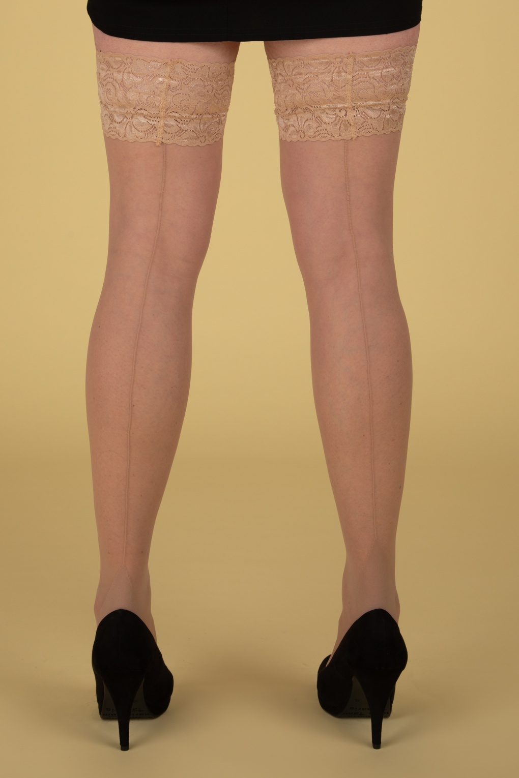 Diese vintage-inspirierten Classic Seamer Lace top Hold-ups in Nude wurden aus einem weichen und feinen Stoff in 15 Denier gefertigt und zeigen eine pfiffige sog. ‚Havana‘ Ferse wie auch eine verführerische Naht in Nude auf der Wade. Die transparenten Strümpfe wurden mit schönen Borten aus Spitze, flachen Nähten und einem verstärkten Zehenbereich versehen. Haltlos und verführerisch vereinen sie den Glamour und den Charme der Vergangenheit mit dem hiesigen Komfort! * Halterlose Strümpfe * Borten aus Spitze * Flache Nähte * Verstärkter Zehenbereich