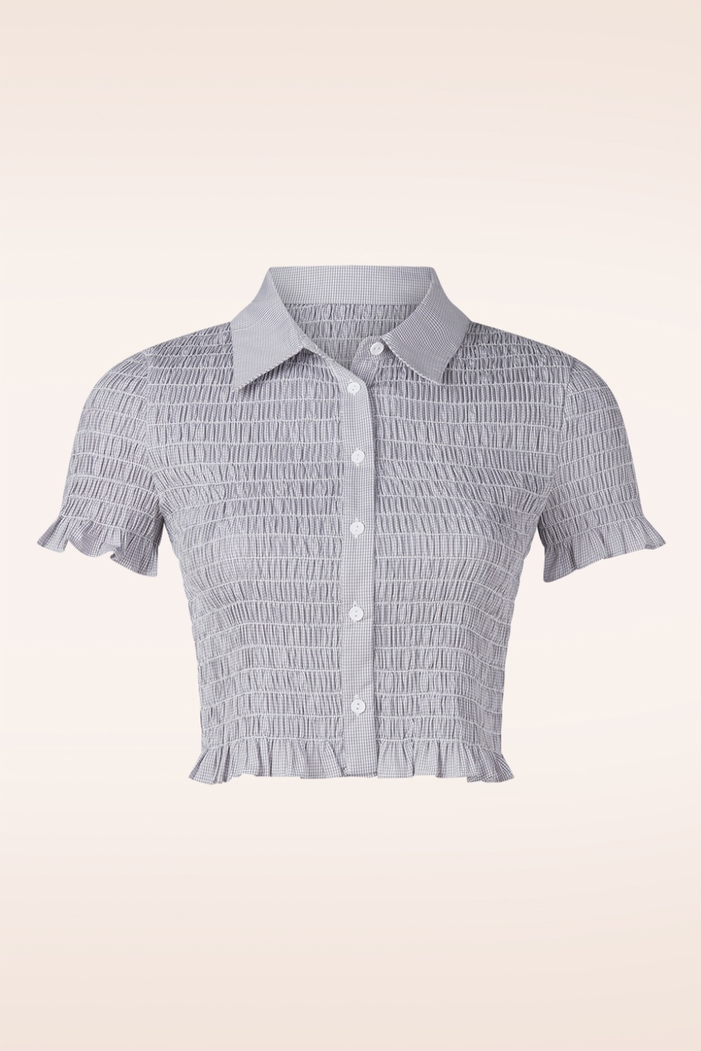 Hübsch, schlicht und einfach bezaubernd: Dieses kurzärmelige Oberteil mit Spitzkragen ist vollständig gesmokt und an den Säumen mit Rüschen versehen. Das Modell ist aus einem festen, aber luftigen Stoff aus 100 % Baumwolle gefertigt und besticht durch ein durchgehendes Vichy-Karo in Grau-Weiß. * Gesmoktes Oberteil * Spitzkragen * Kurze Ärmel * Rüschen an den Säumen * Knopfleiste vorne * Kürzere Länge