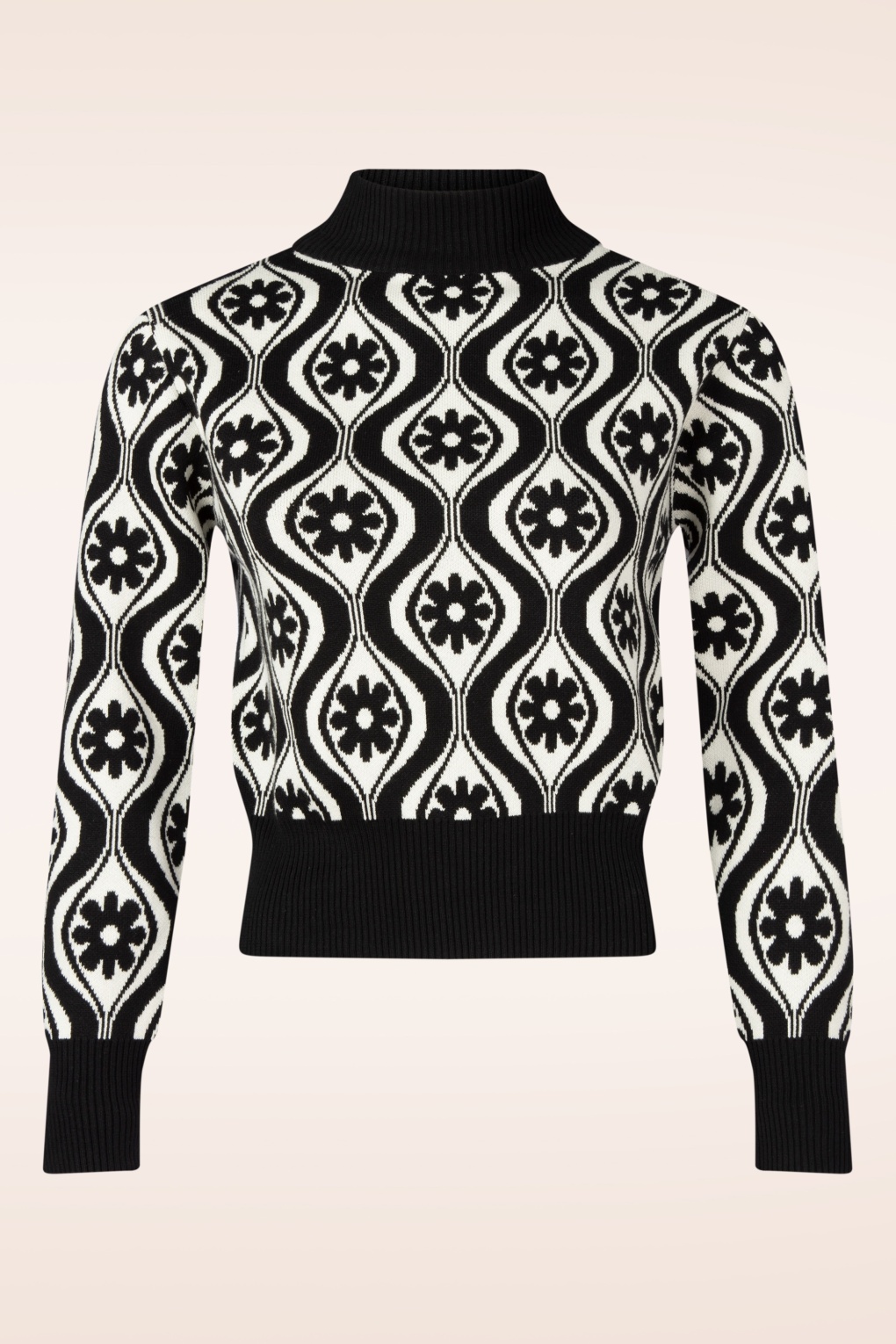 Retro Vibes – Dieser tolle Pulli sieht nicht nur wunderschön aus, er hält dich an kälteren Tagen auch herrlich warm! Gefertigt aus einer feingestrickten, angenehmen und dehnbaren Bio-Baumwolle mit einem Retro-Blumenmuster in Schwarz und Weiß. * Kleiner Stehkragen * Stretchy Rippbündchen * Lang genug, um mit einer normalen Hose kombiniert zu werden