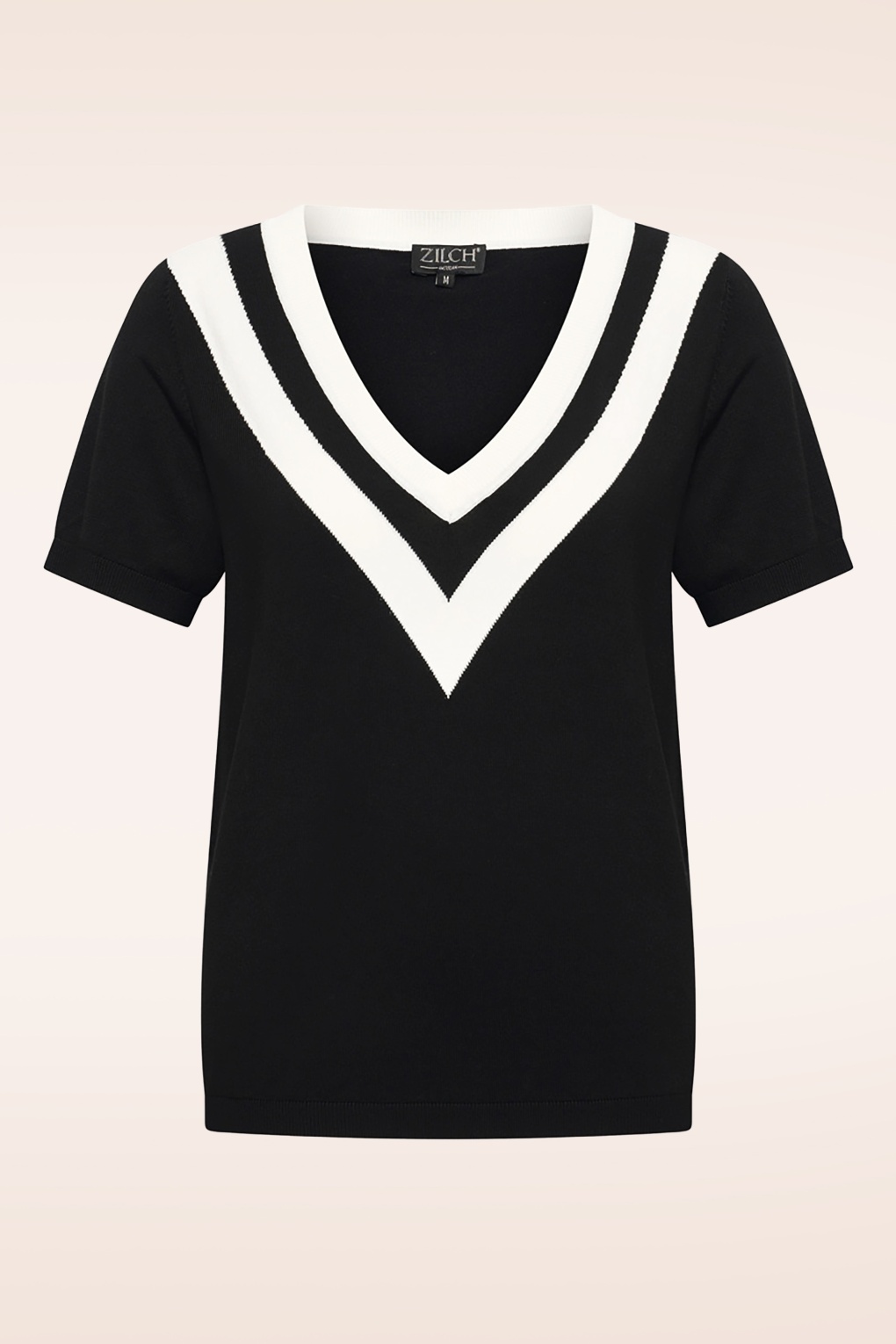 Bequem und stylisch zugleich: Dieses locker sitzende Oberteil mit V-Ausschnitt ist aus einer fein gestrickten, weichen und elastischen Bambus-Viskose-Mischung in Schwarz gefertigt. Das Modell ist herrlich angenehm zu tragen und besticht durch kontrastierende weiße Akzente. * V-Ausschnitt * Lockere Passform * Kurze Ärmel * Passend für Hosen mit normaler Leibhöhe