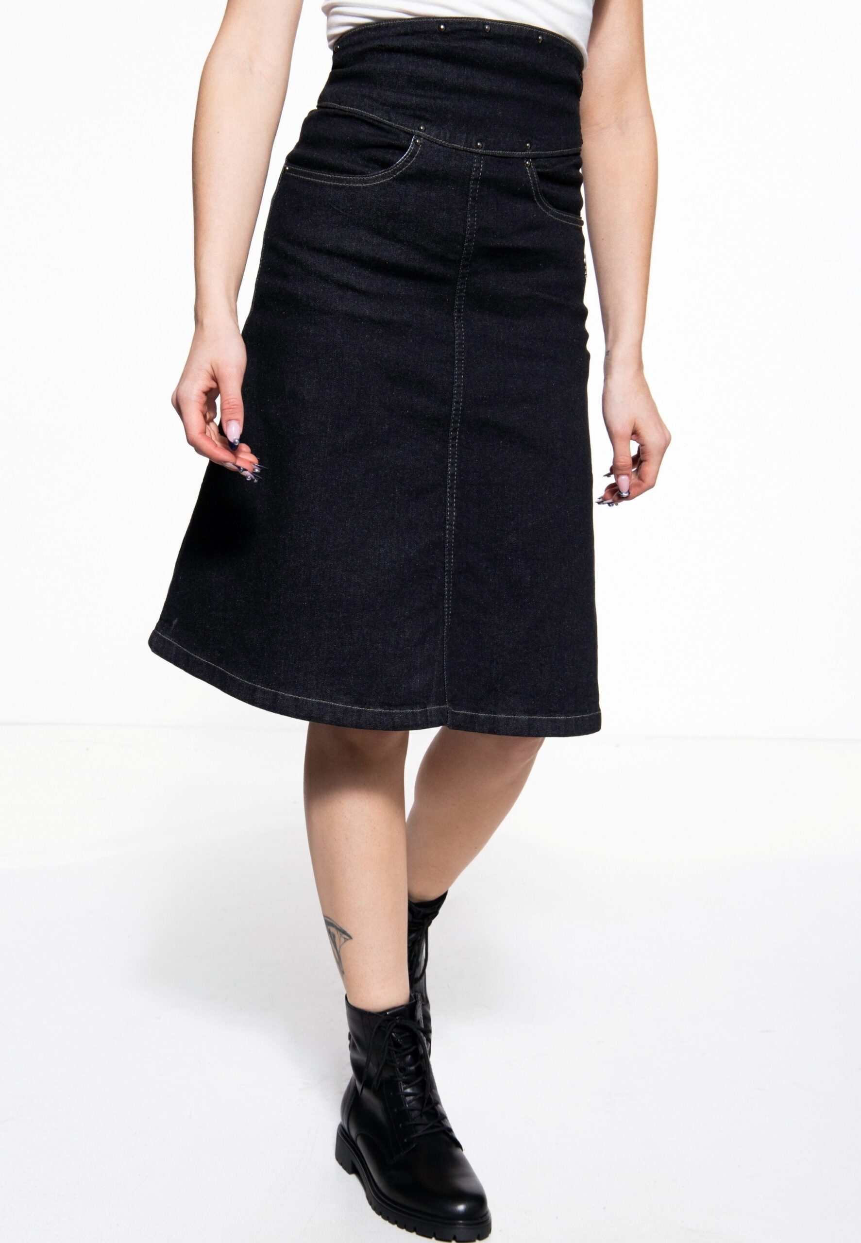 Der Denim A-Linien-Rock von Queen Kerosin verleiht deinem Look eine rockige Note und sorgt für authentischen Style. Sein ausgestellter Schnitt in Kombination mit dem breiten, vorne höher geschnittenen Bund zaubert eine coole Silhouette. Dezente Nieten, Gesäßtaschen und ein kleines metallenes Logo-Emblem an der Seite sorgen für liebevolle Details. Eine Metallschnalle am Rücken erlaubt es, die Weite individuell anzupassen. Der seitliche Reißverschluss mit Hakenverschluss macht das Anziehen unkompliziert, während die elastische Baumwollmischung Bewegungsfreiheit und Tragekomfort bietet. Model Größe: Unser Model ist 168 cm und trägt Gr. XS