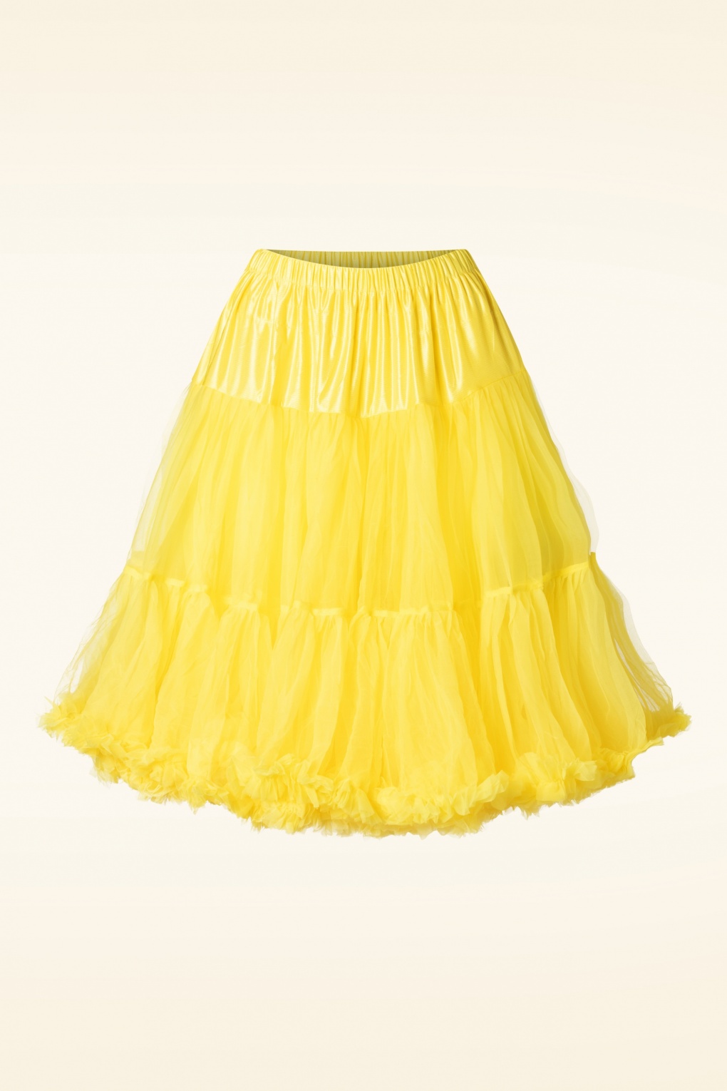 “Behind every great twirl is a trusty petticoat!“ Die doppelte Stoffschicht verleiht extra Volumen und schwingt graziös mit dir mit und wurden mit verspielten Rüschen am Saum versehen. Die oberste Schicht wurde aus zitronengelbem Tüll und der Unterrock aus glänzendem Satin gefertigt. Vollendet mit einem elastischen Bund. Dieser Petticoat verleiht jedem Swing Kleid das gewisse Extra! * Geeignet für all unsere Swing Kleider und Röcke * Elastischer Taillenbund * Fällt über das Knie bei einer Größe von 1,70 m