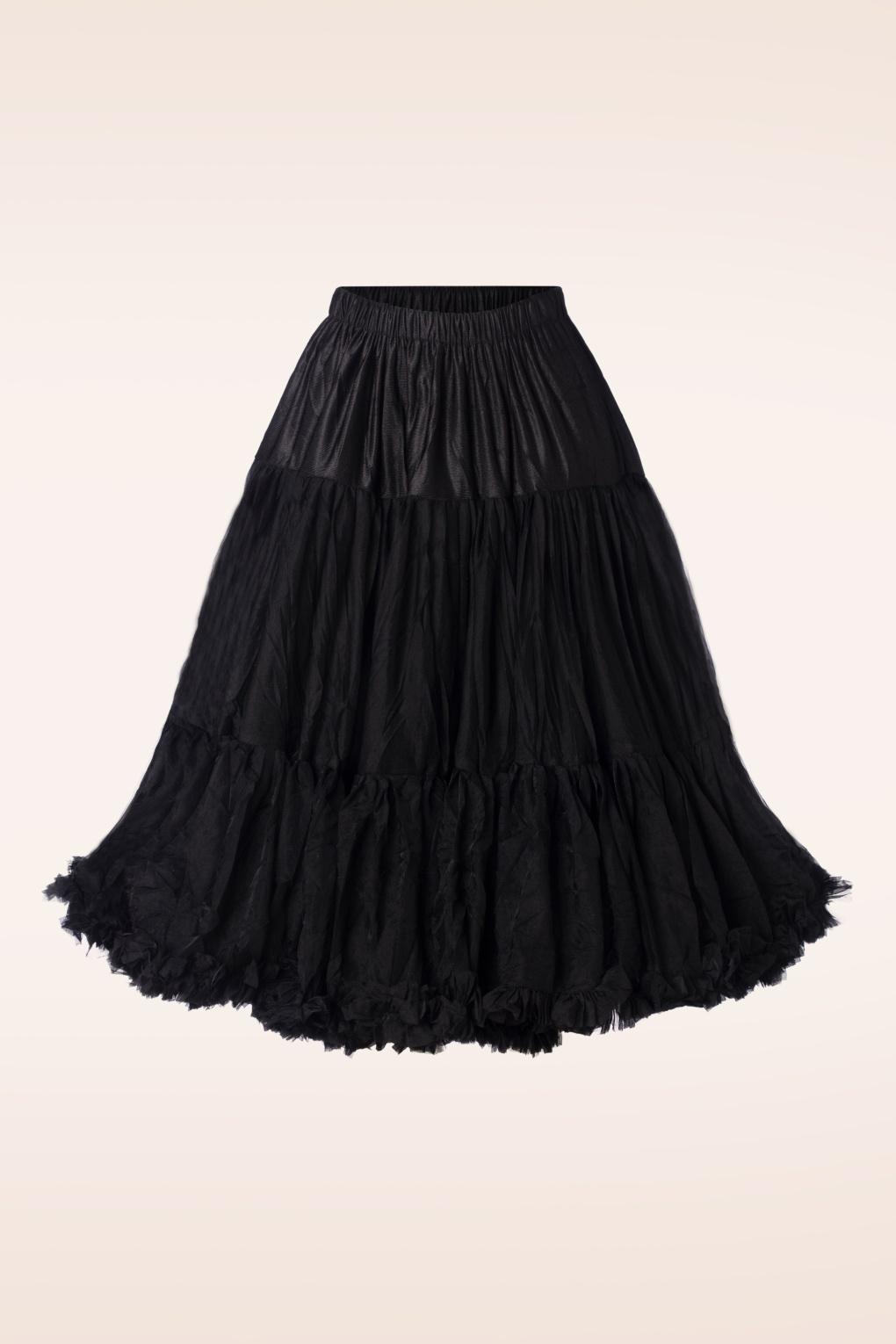 “Behind every great twirl is a trusty petticoat!“ Die doppelte Stoffschicht verleiht extra Volumen und schwingt graziös mit dir mit und wurden mit spielerischen Rüschen am Saum versehen. Die oberste Schicht wurde aus schwarzem Tüll und der Unterrock aus glänzendem Satin gefertigt. Vollendet mit einem elastischen Bund. Dieser Petticoat verleiht jedem Swing Kleid das gewisse Extra! * Plus-size * Geeignet für all unserer Swing Kleider und Röcke * Elastischer Taillenbund * Fällt über das Knie bei einer Größe von 1,70 m