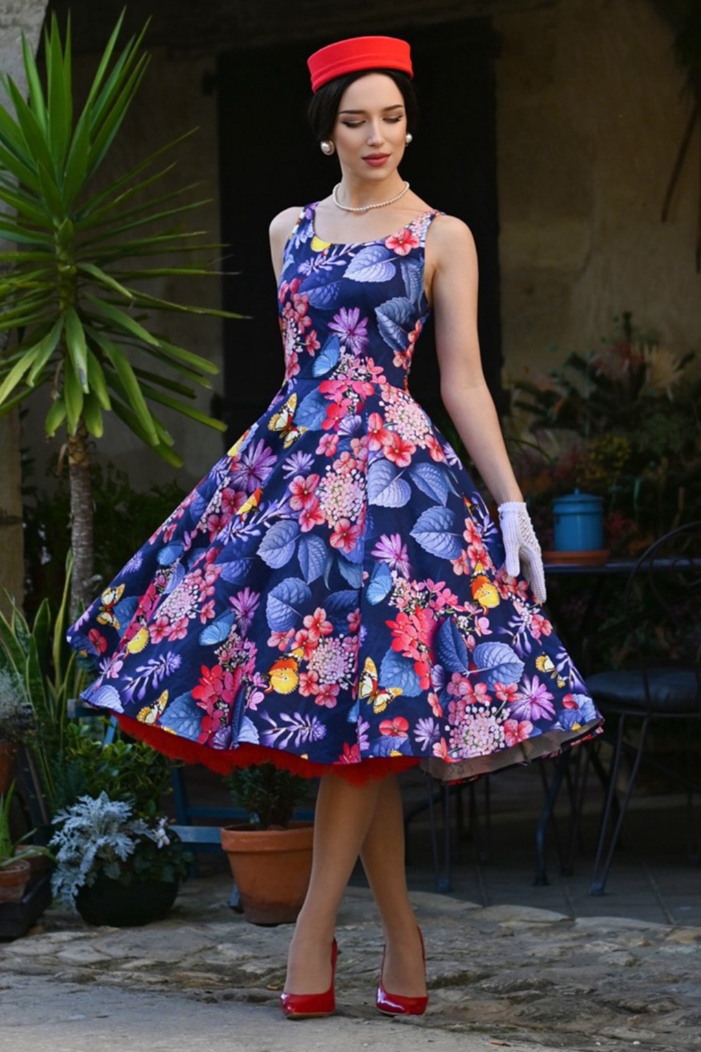 Wo Blumen blühen, flattern auch Schmetterlinge: Das in Gelb-, Rosa- und Violetttönen gehaltene Swingkleid Butterfly Garden ist eine farbenfrohe Hommage an prachtvolle Blumen und Schmetterlinge. Der klassische, weit schwingende Rock bewegt sich mit jedem Schritt anmutig mit, während der Rundhalsausschnitt, die seitlichen Eingrifftaschen und der verdeckte Reißverschluss an der Seite für eine elegante Passform und praktischen Tragekomfort sorgen. Das Modell, das sich für Anlässe aller Art anbietet, ist aus einem festen, aber dennoch geschmeidigen Baummischgewebe gefertigt, das herrlich angenehm zu tragen ist. * Weiter Swing-Style * Rundhalsausschnitt * Seitliche Eingrifftaschen * Verdeckter Reißverschluss an der Seite * In Kombination mit einem unserer Petticoats entsteht ein besonders ausdrucksstarker Look * Endet bei einer Körpergröße von 1,70 m unterhalb des Knies