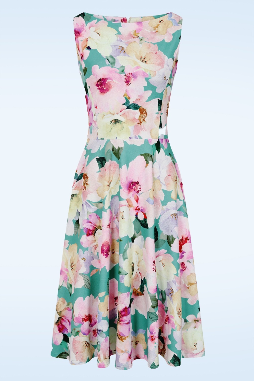 Ein türkisfarbener Traum mit wunderschönen Blumen: Dieses Kleid zaubert garantiert ein Lächeln auf dein Gesicht! Das Oberteil des eleganten, ärmellosen Semi-Swing-Modells ist für zusätzlichen Komfort gefüttert und einfach ideal für sonnige Tage. Das Kleid ist aus einem elastischen, crêpe-ähnlichen Stoff in Türkis gefertigt und besticht durch einen hübschen Blumenprint in Gelb- und Rosatönen, der für eine romantische, feminine Note sorgt. * Semi-Swing-Modell * Oberteil für zusätzlichen Komfort gefüttert * Ärmellos * Verdeckter Reißverschluss hinten * Endet bei einer Körpergröße von 1,70 m unterhalb des Knies * Exklusiv bei Topvintage erhältlich