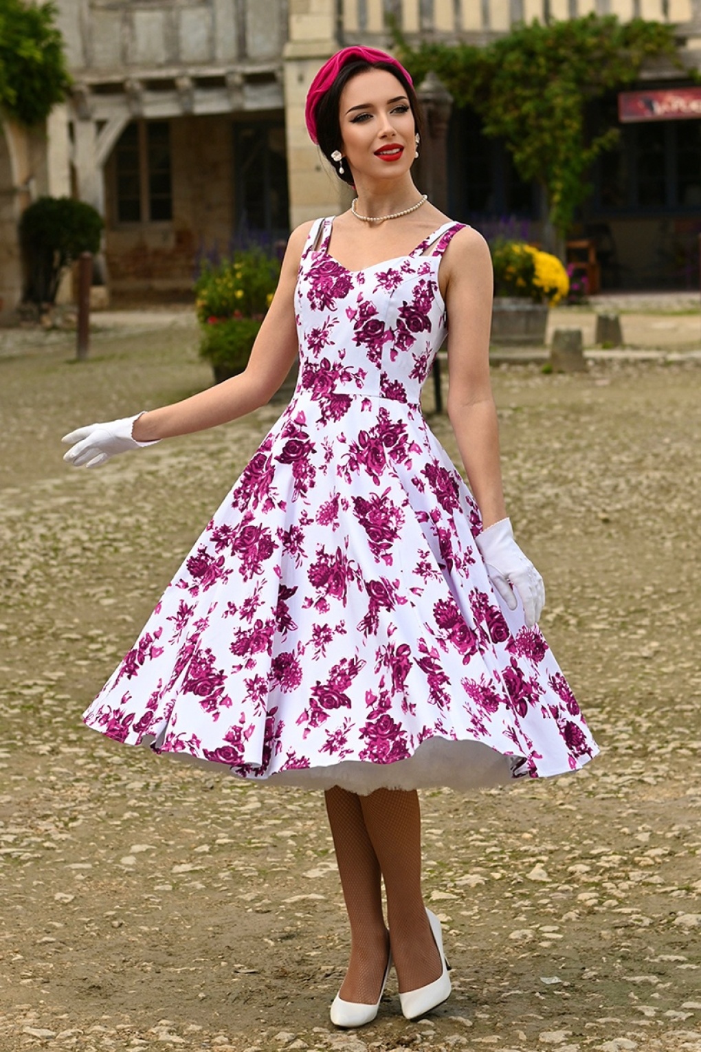 Dieses Frenchie Floral Swing Kleid ist schöner als der schönste Blumenstrauß! Es hat einen klassischen Sweetheart-Ausschnitt, einen schwingenden Tellerrock ud praktische Seitentaschen. Gefertigt aus einem festen aber luftigen, leicht dehnbaren, weißen Baumwollmix, der sich herrlich trägt und mit wunderschönen Rosen in Dunkelrosa übersät wurde. „Perfect for dancing and romancing!“ * Full Swing Modell * Sweetheart-Halslinie * Taschen * Verdeckter Reißverschluss hinten * Kombiniere mit einem unserer Petticoats für einen besonderen Effekt * Fällt bei einer Größe von 1,70 m über das Knie