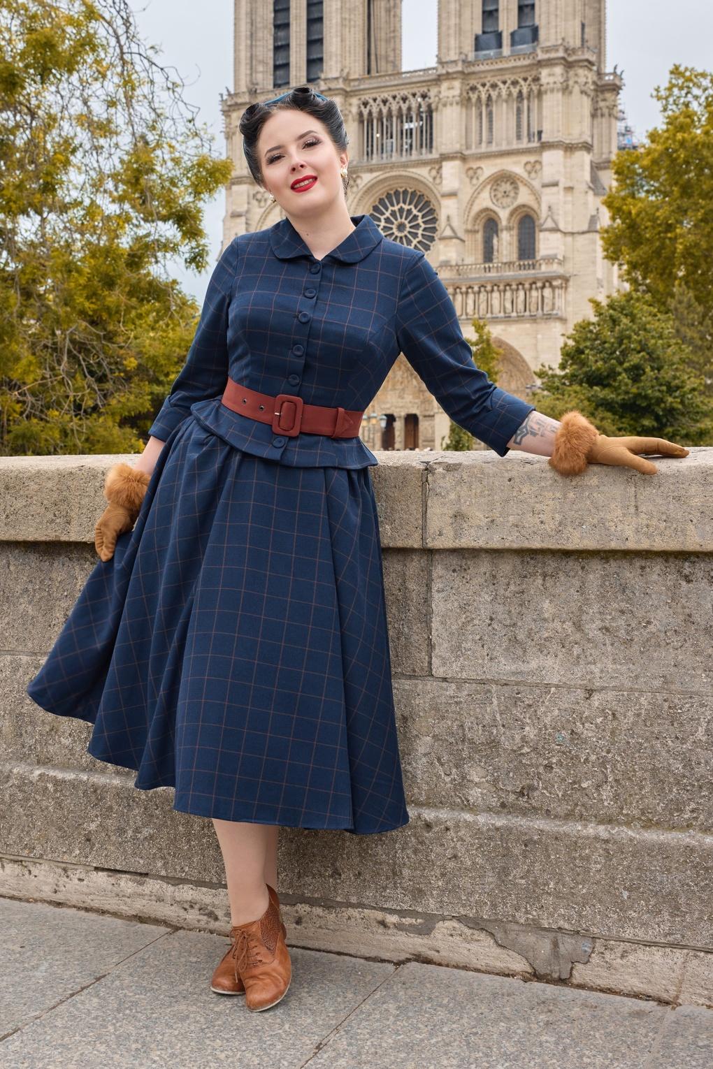 Klassischer Charme trifft auf modernes Flair! Dieses wunderschöne Teil aus der neuen Kollektion von Miss Candyfloss wurde von der herausragenden französischen Modedesignerin Marie-Louise Carven inspiriert, die in den 1940er und 1950er Jahren Pionierarbeit leistete. Das Modell Maissa Lee strahlt mit seinem schmeichelhaften Swingrock und dem klassischen Peter-Pan-Kragen zeitlose Eleganz aus. Es hat praktische seitliche Eingrifftaschen und einen abnehmbaren Gürtel, der deine Taille wunderbar betont und eine feminine Silhouette zaubert. Das dunkelblaue Kleid ist aus einem festen, aber dennoch geschmeidigen Mischgewebe mit einem Hauch Viskose gefertigt und besticht durch ein Karomuster im Rotton Sienna, das einen schicken und zugleich modernen Look erzeugt. * Swingkleid * Peter-Pan-Kragen * ¾-Ärmel mit fest vernähten Umschlägen * Knopfleiste vorne * Verdeckter Reißverschluss hinten * Schößchen * Abnehmbarer Gürtel für eine besonders betonte Taille * Mit Taschen! * Endet bei einer Körpergröße von 1,70 m unterhalb des Knies