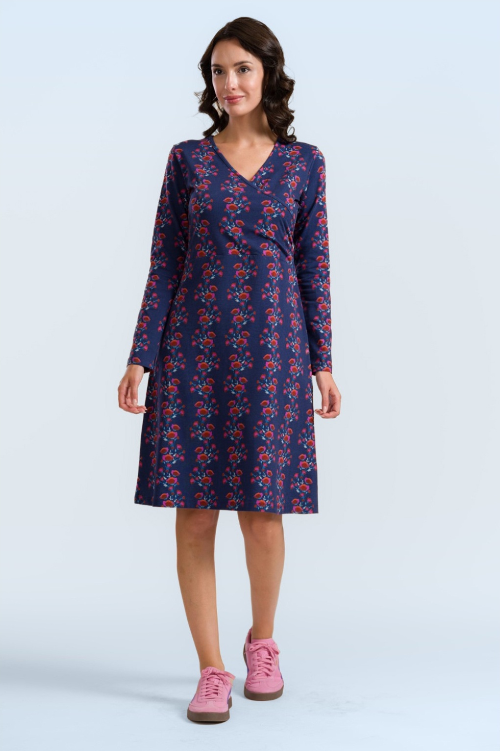 Hier stehen Mohnblumen im Rampenlicht! Das Kleid Chrissy Cross in Dunkelblau ist ein zeitloses Must-have, das in dieser Saison in keinem Kleiderschrank fehlen darf. Das elegante langärmelige Oberteil in Wickeloptik geht in einen weich fließenden A-Linien-Rock über, der jedem Figurtyp schmeichelt. Das Modell ist aus einer weichen, elastischen Bio-Baumwollmischung gefertigt und besticht durch einen verspielten Print aus leuchtenden Mohnblumen, der für einen locker-leichten Retro-Touch sorgt. * Ausgestellter Schnitt * Oberteil mit angedeuteter Wickeloptik * Lange Ärmel * Kein Reißverschluss, keine Knöpfe: einfach reinschlüpfen und los geht’s! * Endet bei einer Körpergröße von 1,70 m knapp unterhalb des Knies