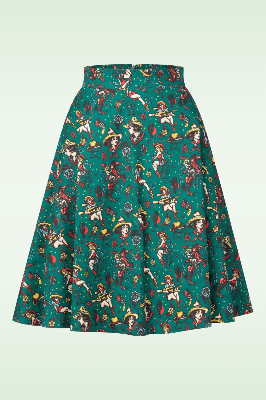 Schnapp dir diese wunderbare Kombination aus Wildem Westen und Rockabilly! Dieser dunkelgrüne Swingrock hat alles, was du dir wünschst: Er ist feminin, verspielt und auffällig. Das Modell mit einer schmeichelhaften hohen Taille und praktischen Taschen schwingt bei jedem Schritt wunderschön mit. Das attraktive Cowgirl-Muster verleiht ihm einen einzigartigen Retro-Look, der perfekt zu Rockabilly-Outfits passt. Der Rock ist aus einem festen, aber dennoch geschmeidigen Baumwollmischgewebe gefertigt, das dank eines geringen Stretchanteils besonders bequem sitzt. * Swing-Modell * Mit Taschen! * Endet bei einer Körpergröße von 1,70 m knapp auf Kniehöhe