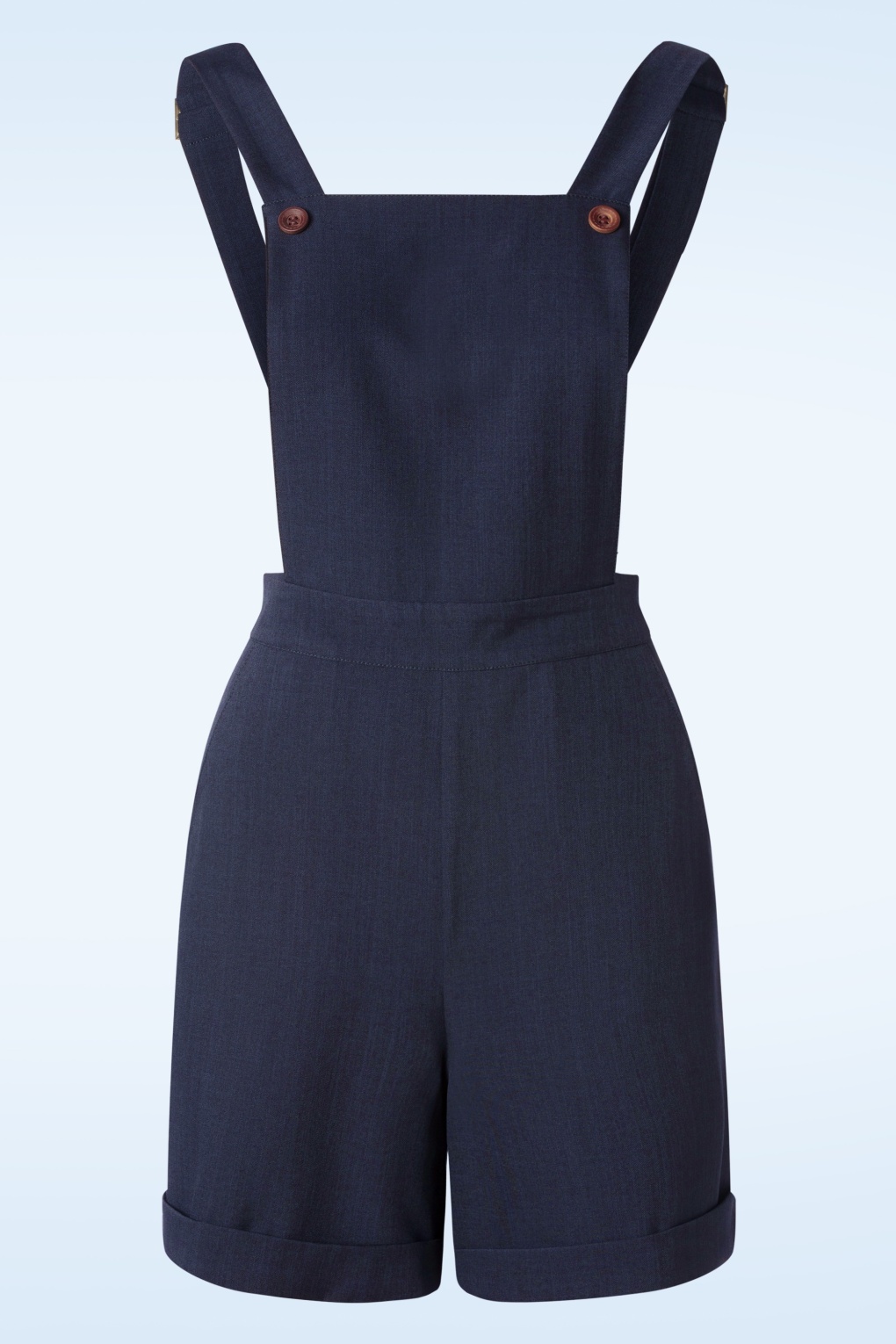 “La vie en blue“ Dieser Playsuit wurde aus einem festen und angenehmen, marineblauen Stoff gefertigt, der sich herrlich komfortabel trägt. * Verstellbare Schulterträger * Dekorative Knöpfe vorne * ‚It has pockets!‘ * Verdeckter Reiß- mit Hakenverschluss hinten * ‚Faux‘ Paspeltaschen hinten * Kurze, weite Hosenbeine mit fest umgeschlagenen Saum