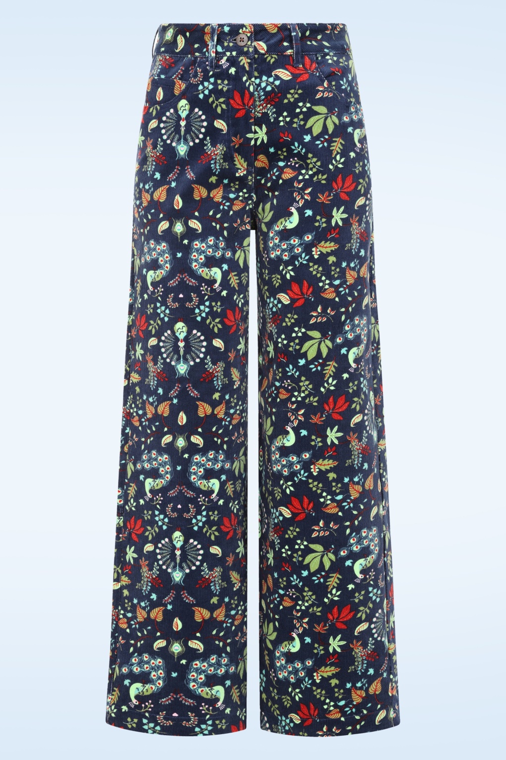 Jedes Outfit sollte einen besonderen Pfiff haben: Diese klassische 5-Pocket-Cordhose ist aus einer Bio-Baumwollmischung in Dunkelblau gefertigt und besticht durch ein farbenfrohes Pfauenmuster – bequem, stylisch und ein bisschen verspielt. * Hohe Taille * Klassischer 5-Pocket-Stil * Mit Gürtelschlaufen * Reißverschluss und Knopf vorne * Lange, gerade geschnittene weite Hosenbeine