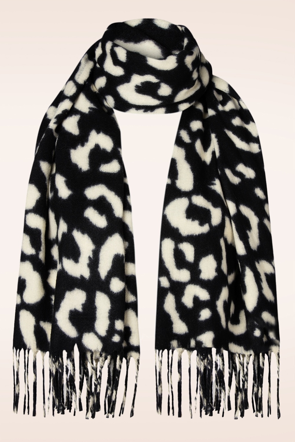 Dieser stylische Schal hält dich in der kalten Jahreszeit kuschelig warm! Das Modell mit Fransen ist aus einem luxuriösen, weichen Stoff mit schwarz-weißem Animal-Print gefertigt. * Rechteckiger, langer Schal * Weich und warm * Kann auf verschiedene Arten getragen werden