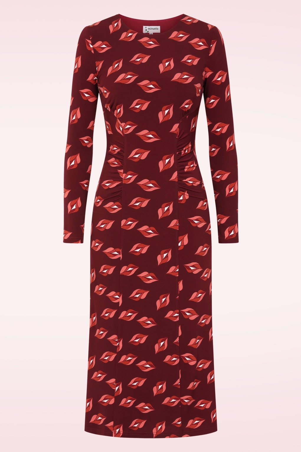 Ein Traum in dunklem Weinrot und mit Kussmund-Print! Das Midikleid Raffaella ist aus einem anschmiegsamen, elastischen dunkelroten Stoff gefertigt, den ein grafischer Kussmund-Print ziert. * Midikleid * Rundhalsausschnitt * Lange Ärmel * Schmeichelnde Raffungen * Vollständig gefüttert * Kein Reißverschluss, keine Knöpfe: einfach überziehen und los geht’s! * Endet bei einer Körpergröße von 1,70 m auf halber Wadenhöhe