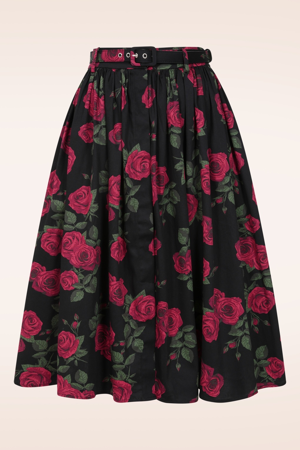 Wie ein wunderschöner Strauß Rosen – auffällig und unvergesslich! Dieser Swingrock mit Knöpfen wird hoch in der Taille getragen und sorgt für eine besonders feminine Silhouette. Gefertigt aus einem geschmeidigen schwarzen Stoff aus 100 % Baumwolle (nicht elastisch), der durch einen klassischen Print mit roten Rosen besticht. * Weiter Swing-Style * Seitliche Eingrifftaschen * Knopf und Haken vorne * Mit Gürtelschlaufen * Abnehmbarer passender Gürtel * Kann mit einem unserer Petticoats kombiniert werden * Endet bei einer Körpergröße von 1,70 m unterhalb des Knies