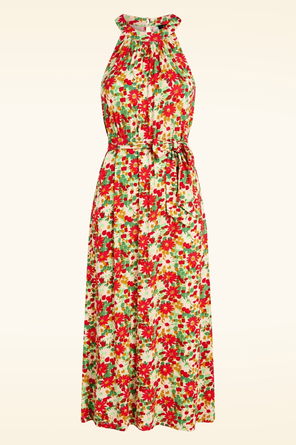 “Bloom baby, bloom!“ Gefertigt aus einem angenehmen und dehnbaren, zartrosa Ecovero Viskosemix mit Blümchen in Rot und Grün – trägt sich herrlich. * Midi Modell * Keyhole mit Knopfverschluss hinten * Abnehmbarer Bindegürtel für eine besonders tolle Taille * Schlitze an der Seite * Reicht bei einer Größe von 1,70 m bis zur Mitte der Wade * Bitte beachte: Die Farbe der Hose im Video kann von der tatsächlichen Farbe der Hose abweichen.
